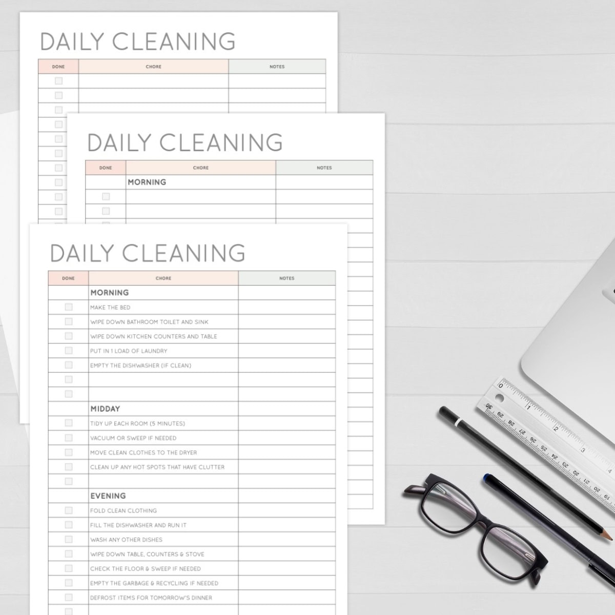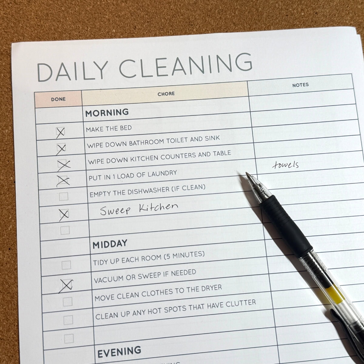 Get a piece of paper and start brainstorming your top cleaning tasks. Once you have your most important tasks on the list begin to add other cleaning tasks that you want to be done daily.
